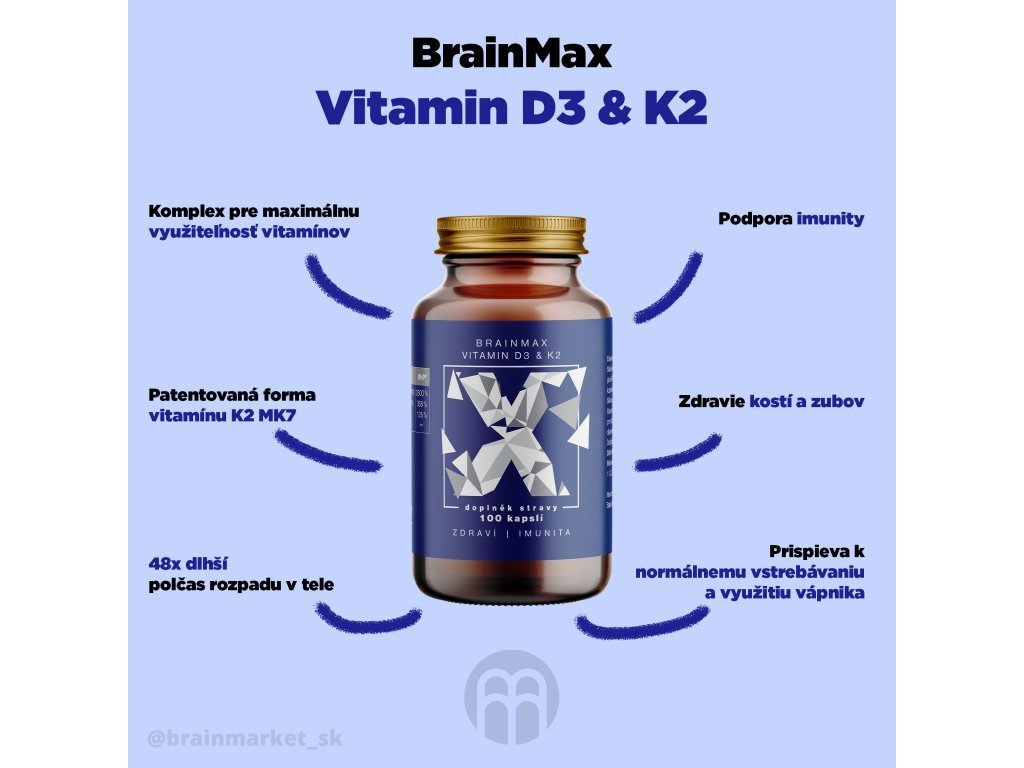 BrainMax Vitamín D3 & K2 kombinuje vitamíny D3 a K2 ako MK7, dve mikro živiny, ktoré boli rozsiahle skúmané pre svoju úlohu v zdraví kostí, zubov a kardiovaskulárneho systému. Vitamín D3 podporuje ukladanie vápnika do kostí, čím zlepšuje zdravie kostí. S vyšším príjmom vitamínu D3 môže súvisieť ukladanie vápnika do ciev (kalcifikácia ciev). Z tohto dôvodu sme k vitamínu D3 pridali vitamín K2 ako MK7, ktorý čistí cievy od vápnika a pomáha ukladať vápnik do kostí. Je to binárna zbraň, úplná synergia dvoch esenciálnych vitamínov, ktoré sú dôležité pre celkové zdravie. Vitamín D3 si naše telo v lete vytvorí zo slnečného žiarenia, ale vitamín K2 môžeme prijímať iba z potravy. Dosiahnuť však na jeho na požadovanú dennú potrebu je prakticky nemožné.